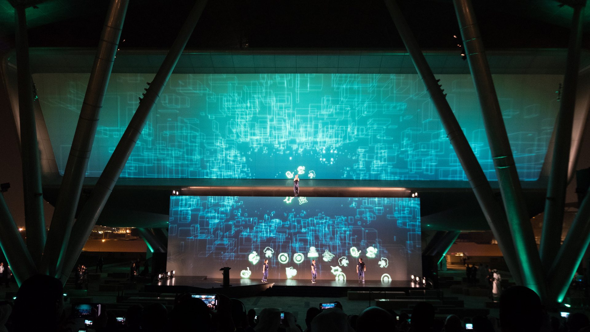 motion graphics and live feed, combined with a bespoke 3D projection mapping of the building façade aligned with the main screen to form one giant media surface for the interactive show production as the highlight of the celebration.